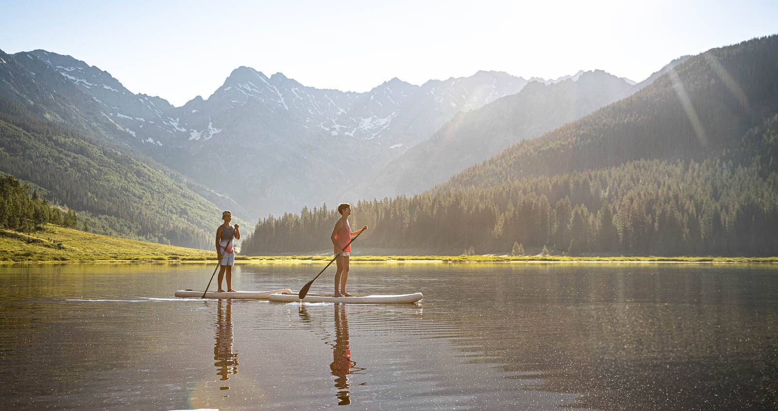 Two people stand-up paddleboarding on a lake near Vail, Colorado, with mountains in the background
