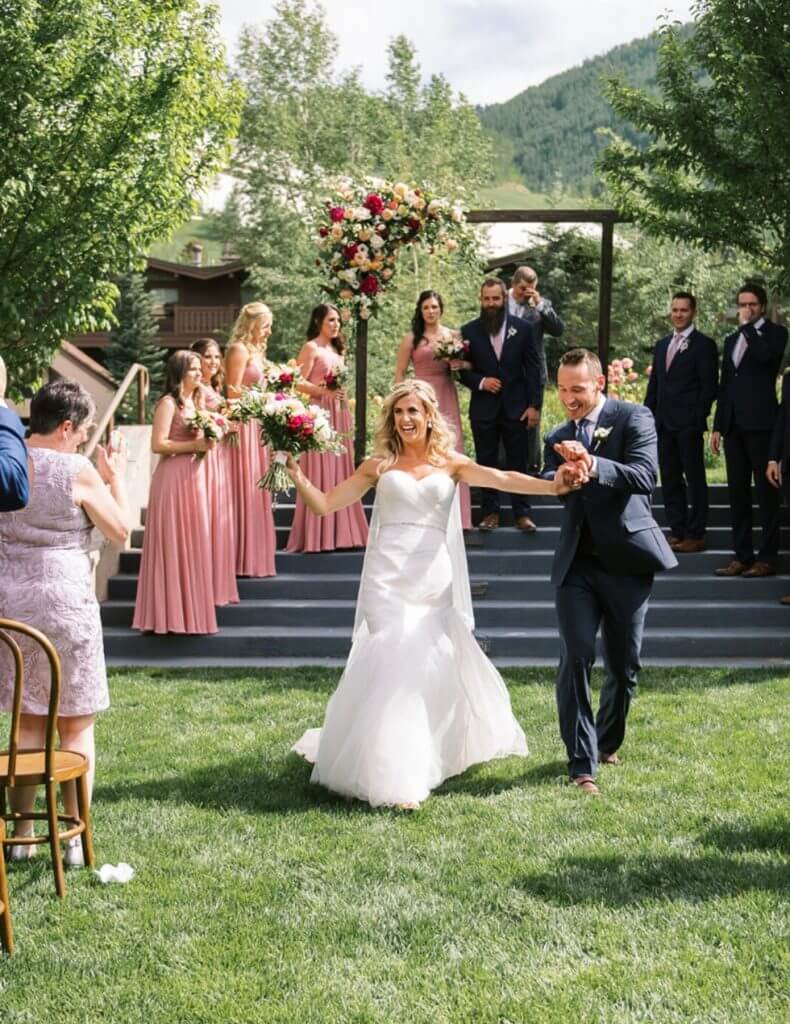A bride and groom walking down the aisle at their outdoor wedding.